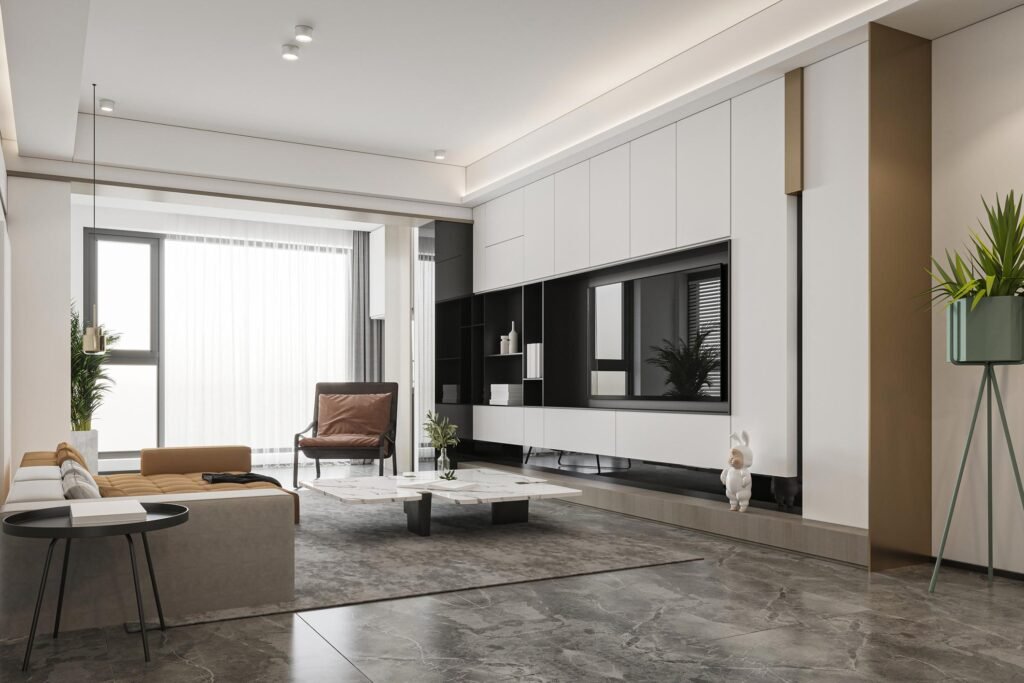 Modern minimalist furniture design emphasises simplicity, clean lines, and functionality, using essential elements to create an uncluttered, serene, and elegant space. The focus is on the form, colour, and texture of a few key pieces, often using monochromatic palettes and functional items without excessive ornamentation.