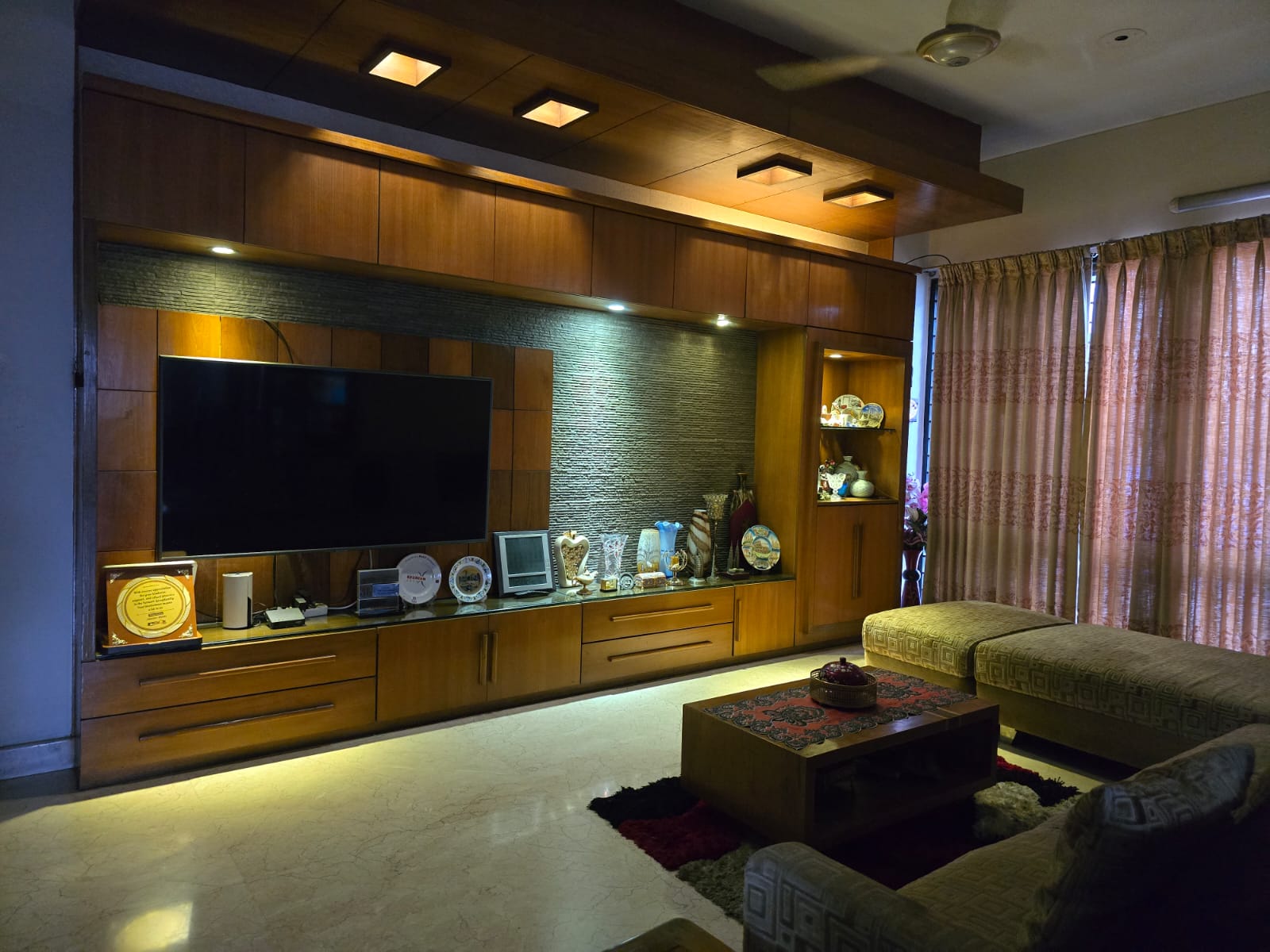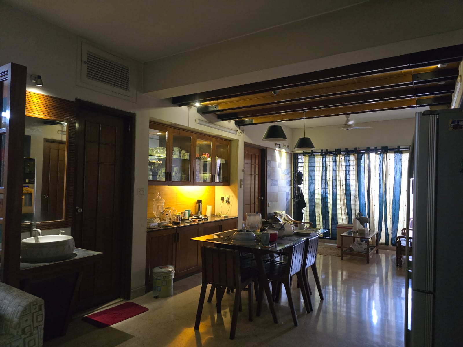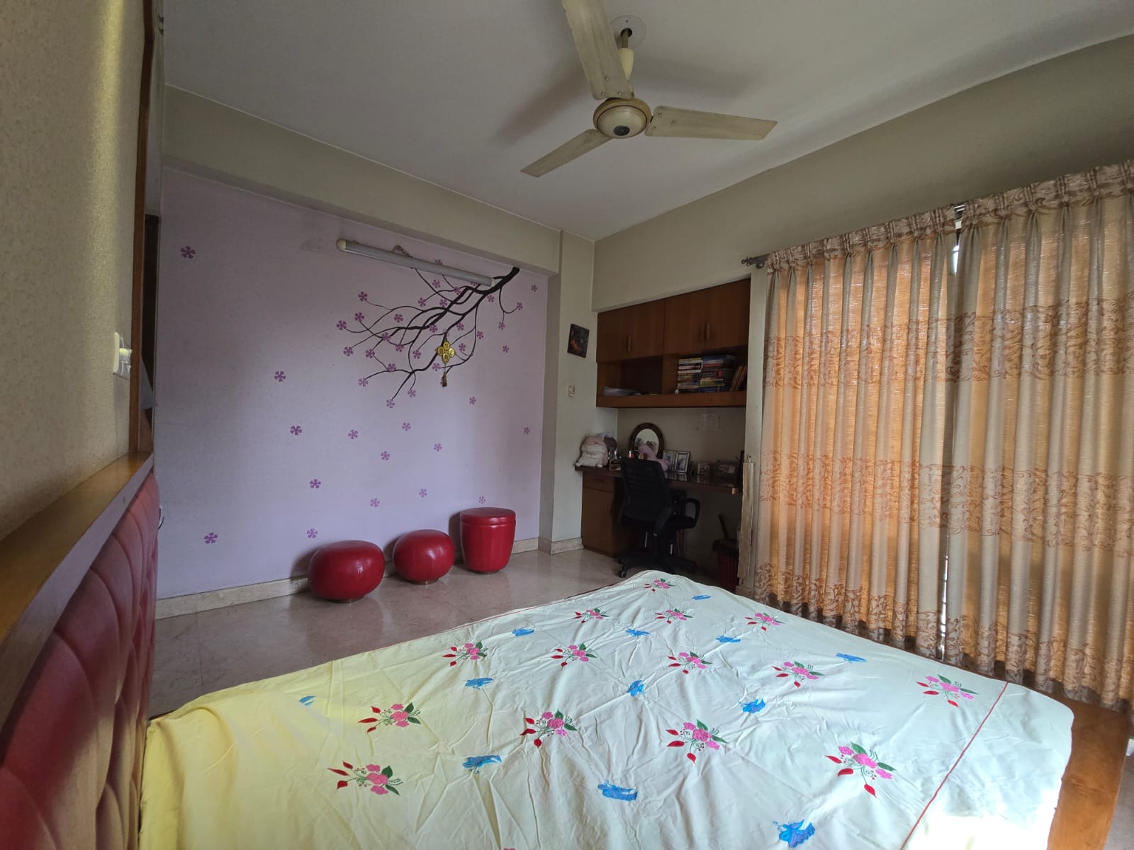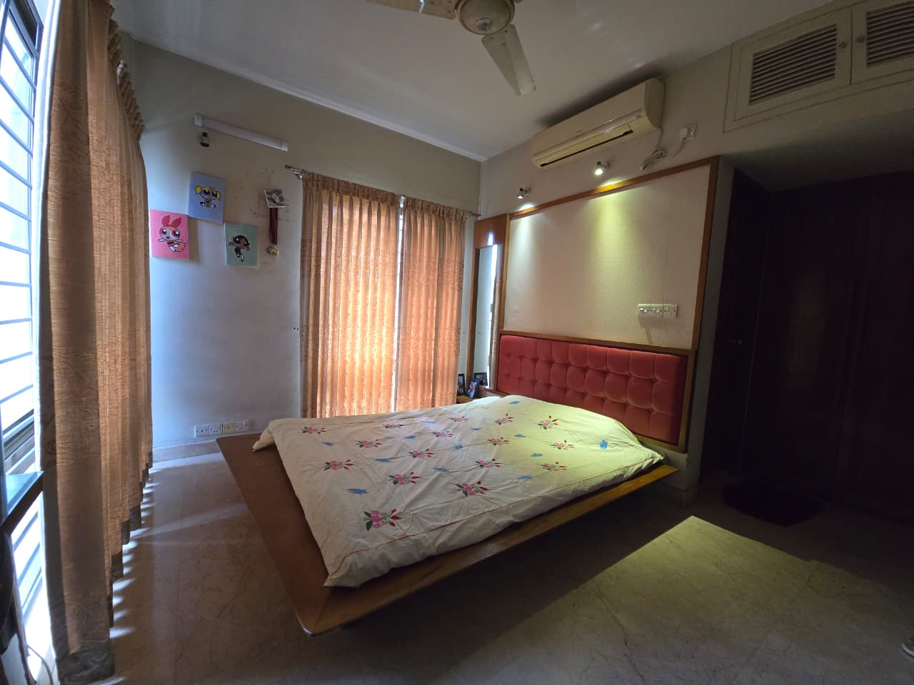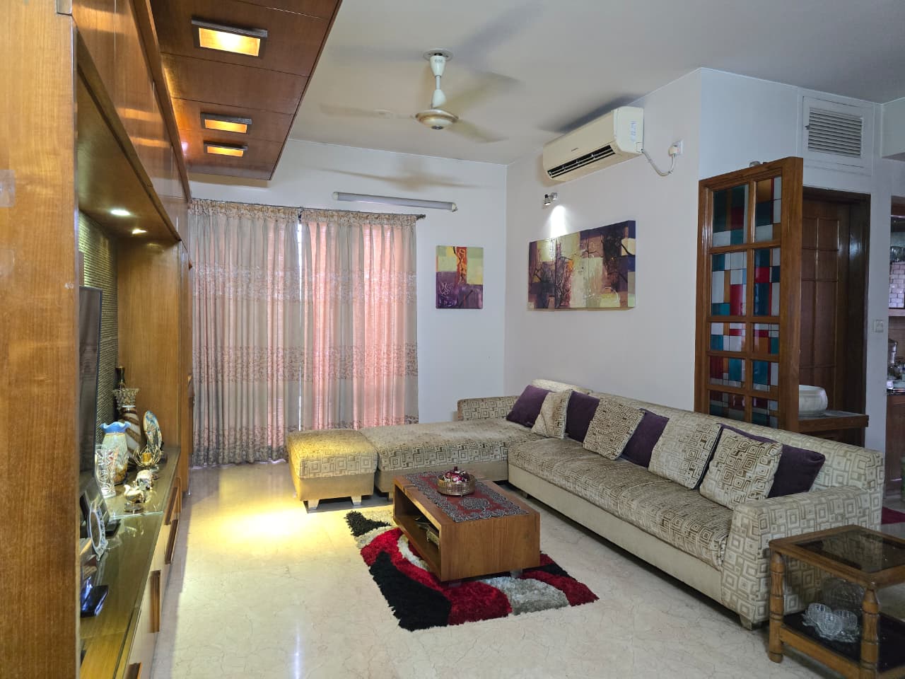 Beds, Living room Sofa set, Dining table with chairs, refrigerator, AC, fully furnished
