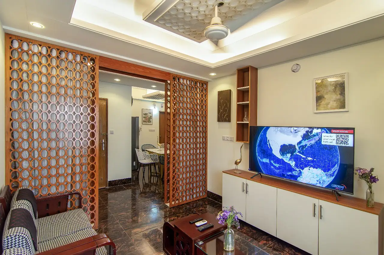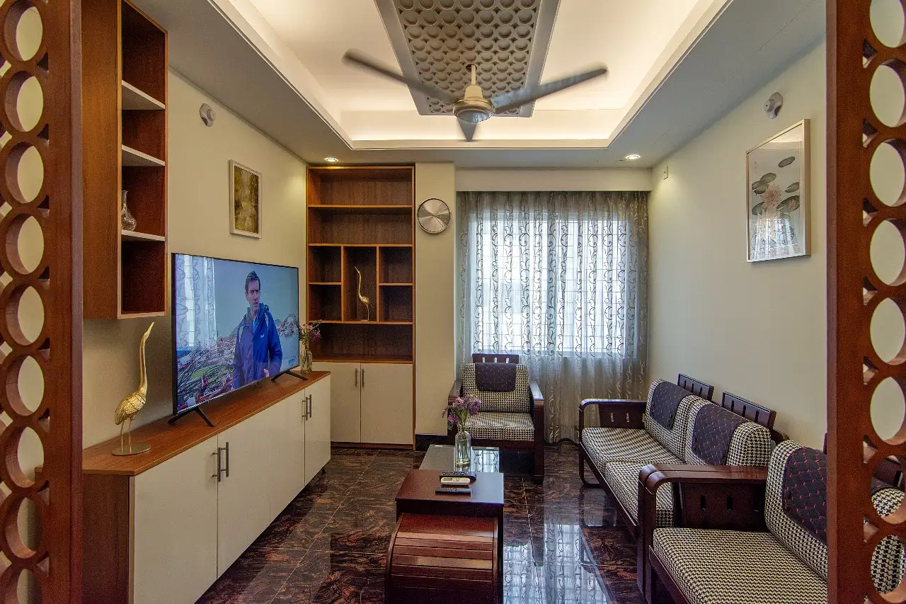 The apartment offers upscale dining areas, a bright and comfortable living room with a 55” Samsung digital cable TV, and a cozy library corner—perfect for unwinding. The fully equipped European-style kitchen includes a Samsung refrigerator and washing machine. Each room is fitted with Samsung air conditioning, complemented by ceiling fans throughout.